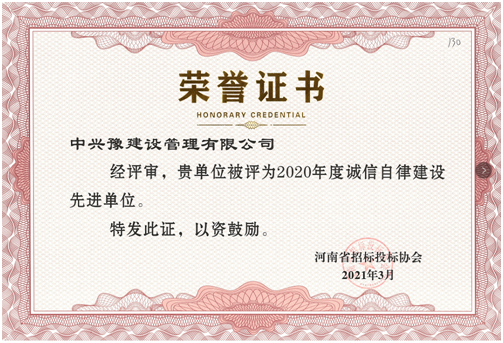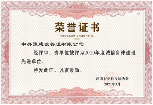 喜報(bào)丨中興豫榮獲2019、2020年度誠(chéng)信自律建設(shè)先進(jìn)單位
